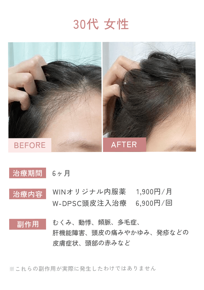 女性の薄毛治療は、男性よりも注意が必要で、より専門的な知識や技術が求められます。ウィンクリニックでは、女性の患者様が安心して治療を受けられるよう、毛髪に関する医学知識に加えて、女性医学の観点からも症状や原因を丁寧にチェックしています。患者様の体への負担に配慮しつつ、一人ひとりに合った効果的な治療をご提案します。
