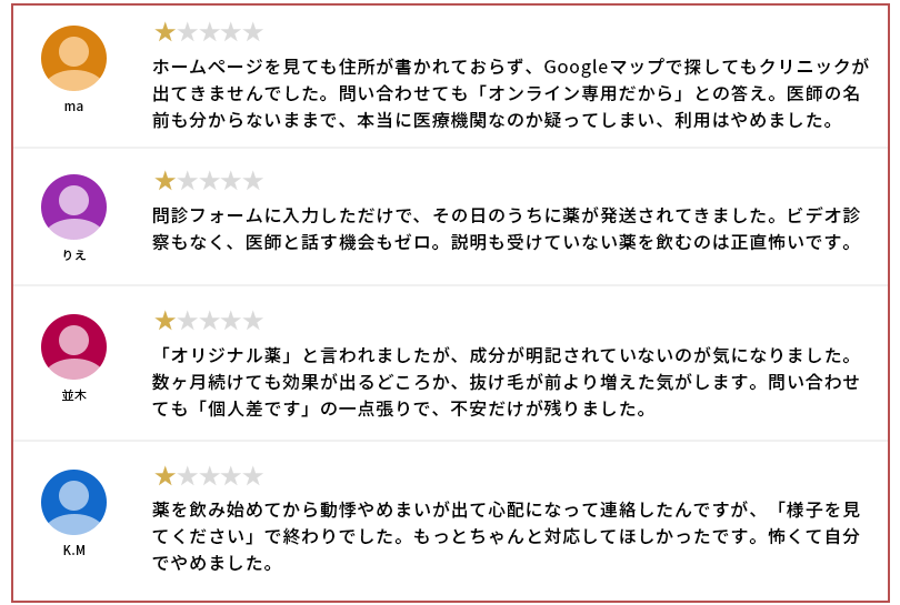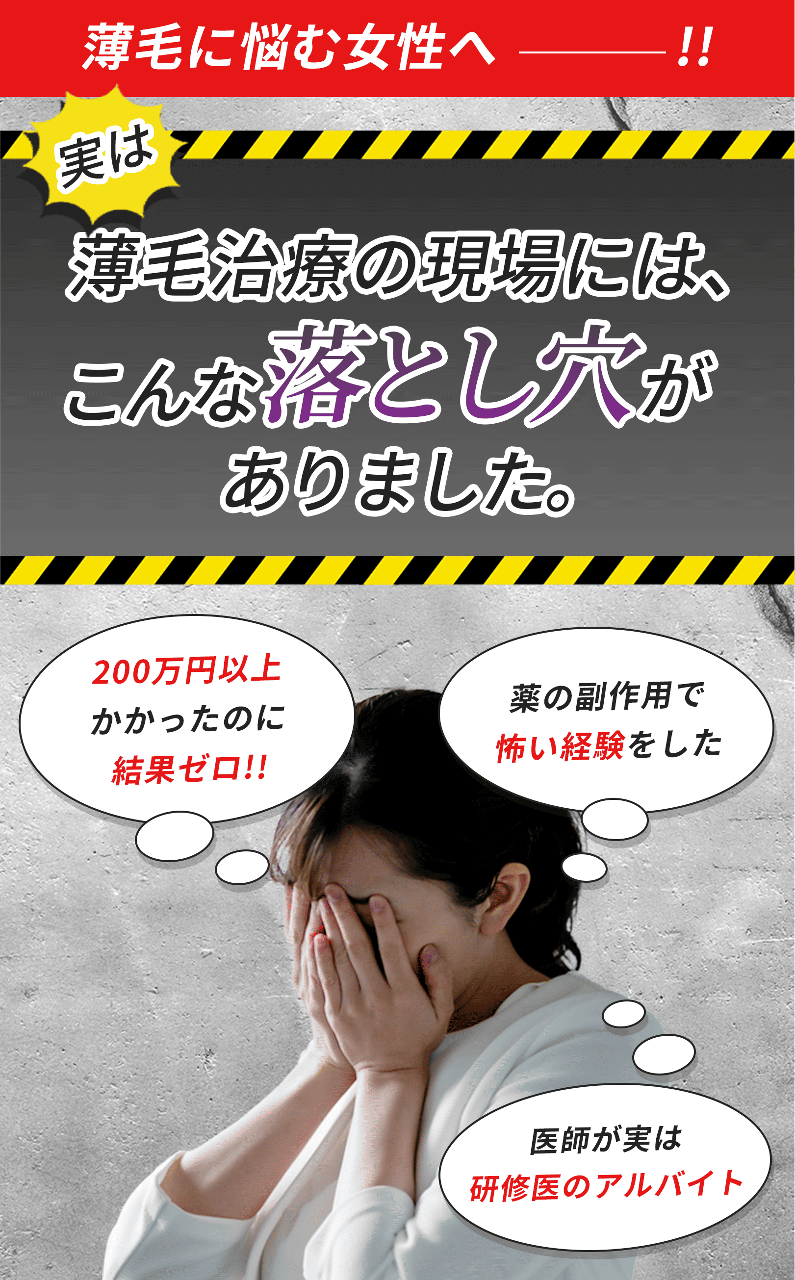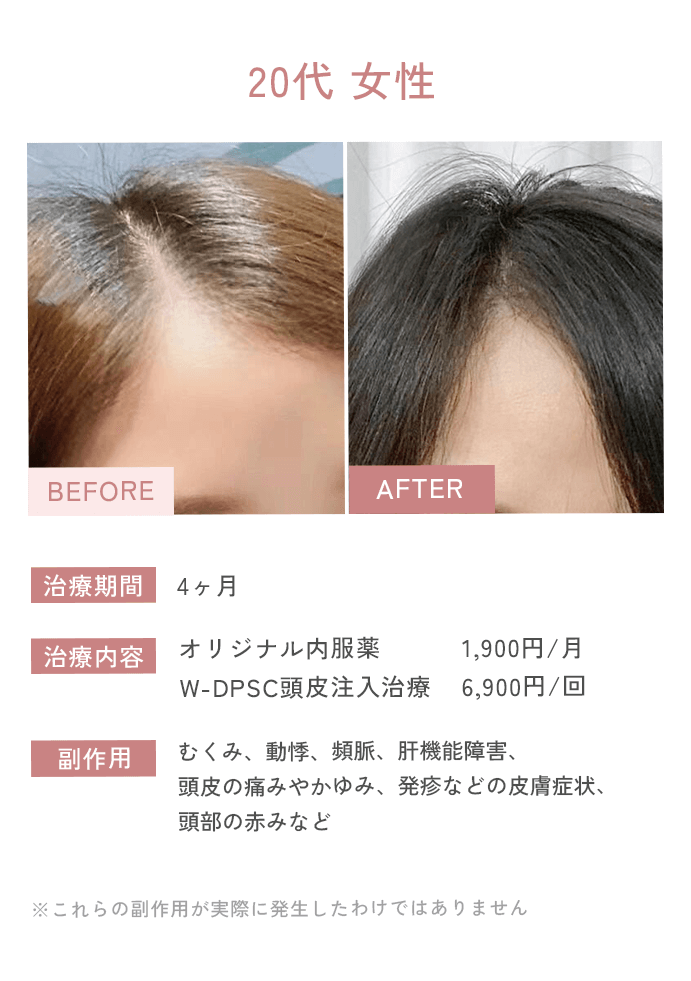 場合によっては、副作用が出ることがあります。例えば、女性には使用できない治療薬を使ったり、体質に合わない処方を行うと、めまい、多毛症、生理不順、肝機能障害、むくみ、血圧上昇、動悸などのリスクがあります。